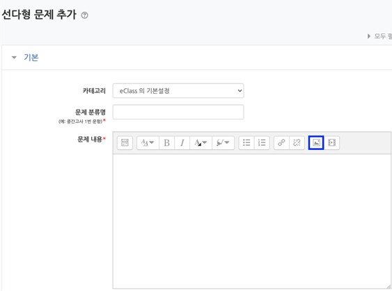 시험문제 출제 등 퀴즈 작성 시 이모티콘이나 이미지를 활용하고자 하신 경우, 문제 추가 시 '문제 내용' 작성란에서 이미지 버튼을 눌러